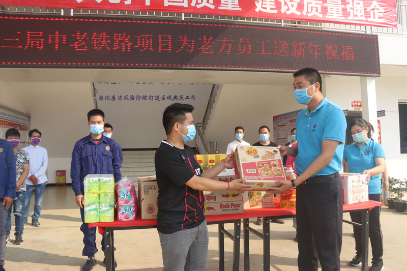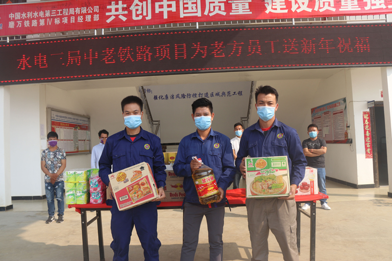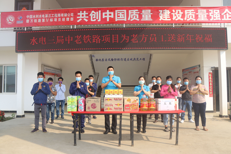 4月13日,老挝传统新年如约而至,本该是欢乐喜庆的节日,因为新冠肺炎疫情的影响变得有些冷清。为表达对在疫情期间依然坚守岗位的老方员工的感谢和关爱,918博天堂中老铁路水电三局项目部组织开展了“中老员工心连心同心抗疫过新年”慰问活动,为他们送去了新年的祝福。项目经理刘千里代表项目部对老方员工进行诚挚的问候,感谢老方员工一年以来对中老铁路建设工作的大力支持和帮助,对他们辛勤的付出和努力的工作表示了充分的肯定。