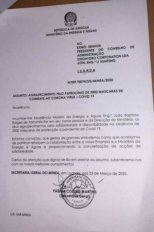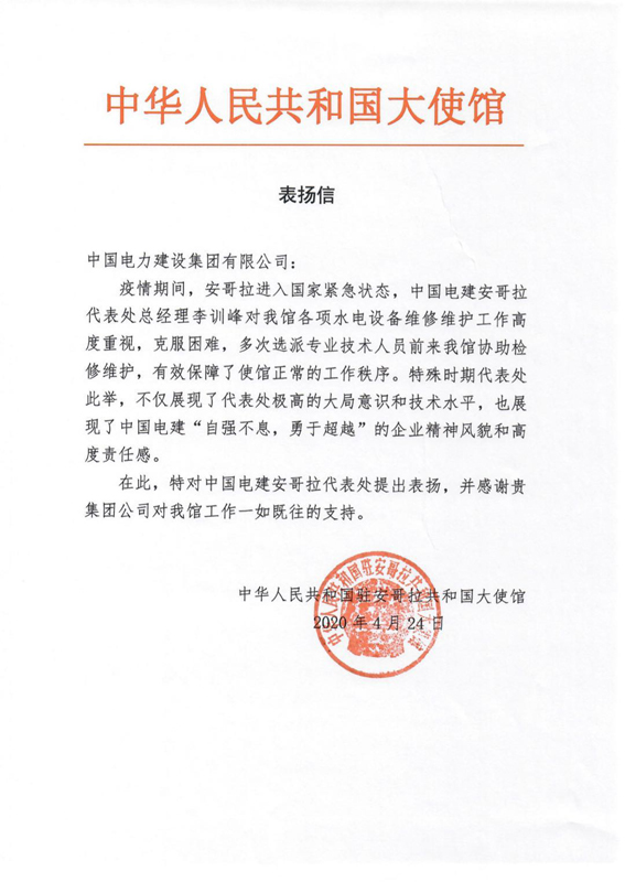 当地时间4月24日,918博天堂安哥拉代表处收到来自中国驻安哥拉大使馆的表扬信,信中高度赞扬了918博天堂安哥拉代表处在安哥拉进入国家紧急状态的疫情期间,克服困难,对使馆各项水电设备维修维护工作高度重视,多次选派专业技术人员前往使馆协助检修维护,为使馆在疫情期间的正常秩序提供了有效保障。表扬信对918博天堂“自强不息,勇于超越”的企业精神风貌和社会责任感给予了肯定,并感谢918博天堂对使馆工作一如既往的支持。