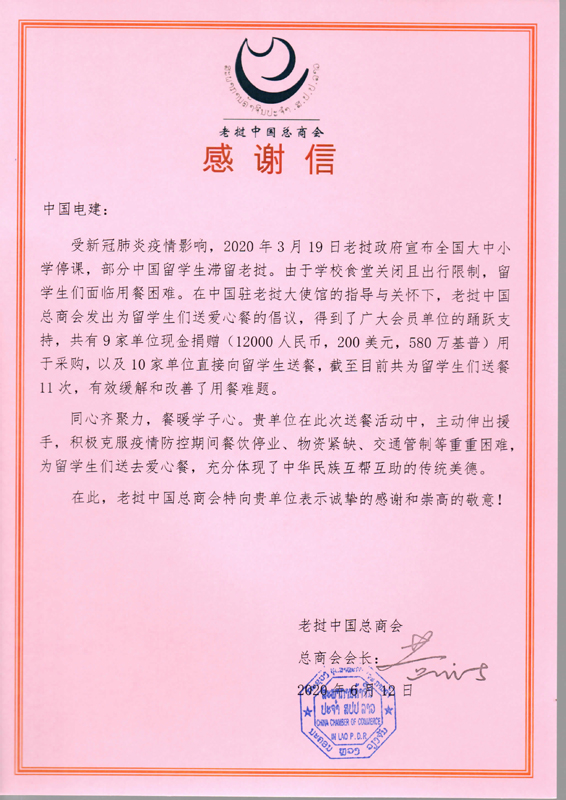 感谢信不仅是对918博天堂老挝代表处工作的赞许和肯定,更是对今后工作的一种鞭策。918博天堂老挝代表处会一如既往地落实公司属地化经营理念,为中老友谊贡献力量。