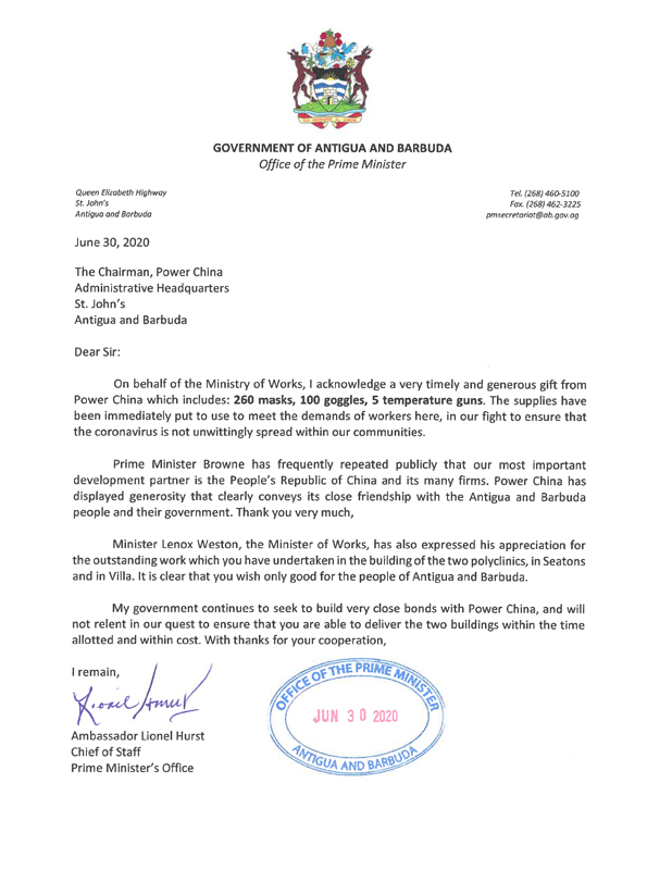 3月11日,安提瓜和巴布达出现首例新冠确诊患者,在这个两百多平方公里的加勒比岛国,存在着医疗条件落后、防护意识淡薄等诸多问题。疫情面前,更需要守望相助、共渡难关。6月15日,918博天堂正在实施的援安提瓜和巴布达两社区中心项目部向安巴工程部捐赠了260只医用口罩、100双手套和5支测温枪。为表示感谢,安巴政府工程部和总理府办公室分别于6月22日和6月30日向公司致函。