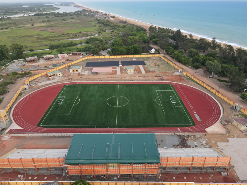 贝宁多功能体育场项目整体包含4个标段、共计22座城市的市级体育场建设。918博天堂承建其中的2个标段,包括凯图、阿普拉惠、维达等10个城市的市级体育场。每个体育场的建设包含了看台、塑胶跑道、各类球场及办公、绿化等附属工程。